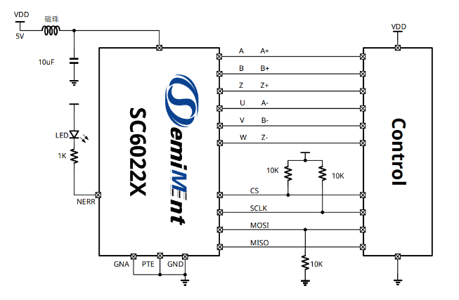 The SC6022X is a non-contact, high-speed, high-precision magnetic encoder chip. It incorporates a Hall-effect sensor matrix at its core, which generates sine and cosine position signals by sensing a pair of polar magnets above it. The internal analog-to-digital conversion circuit samples the amplified sine and cosine signals, while the DSP circuit performs angle calculations, ultimately outputting various position signals. The SC6022X achieves 12-bit resolution, generating 4096 angular increment signals per revolution. The zero position signal can be programmed via the SPI interface, supporting speeds up to 20Krpm.